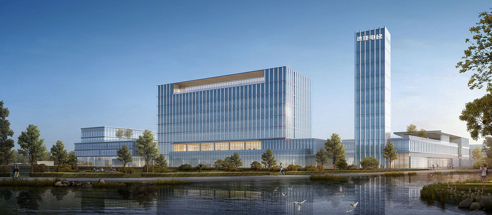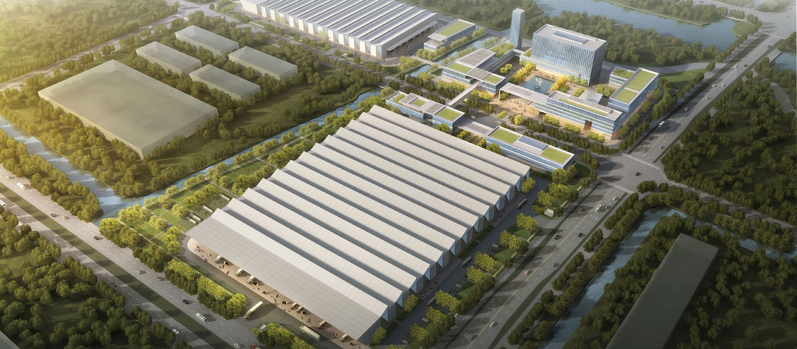 The façade shape formed by the geometric symbol "motif" array of geometric symbols in the factory corresponds to the unique rhythmic plane of the factory, outlining the geometric trend of space upward and plane extension. The diagonal geometry creates a natural skylight that provides uniform lighting for production and creates a unique cross-section. The striped printing of the glazed glass balances shading and daylighting while enriching the delicacy of the façade; The façade is geometrically collaged with color steel plates, forming a sense of technology with industrial aesthetics.